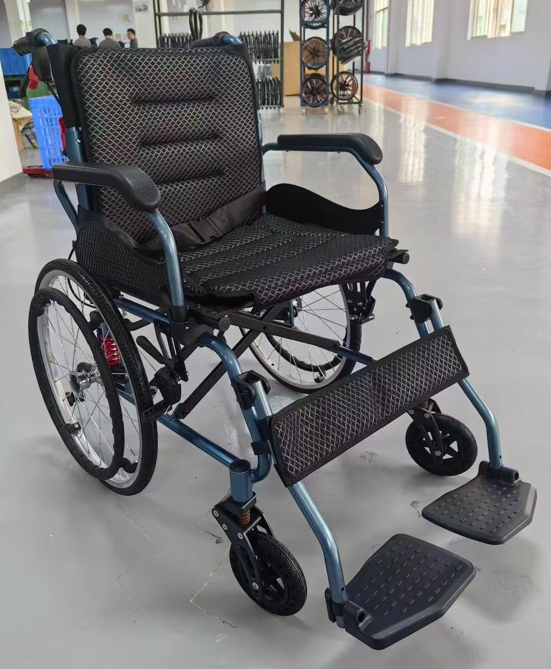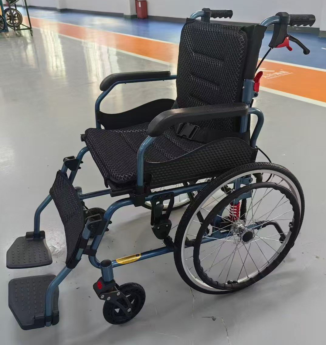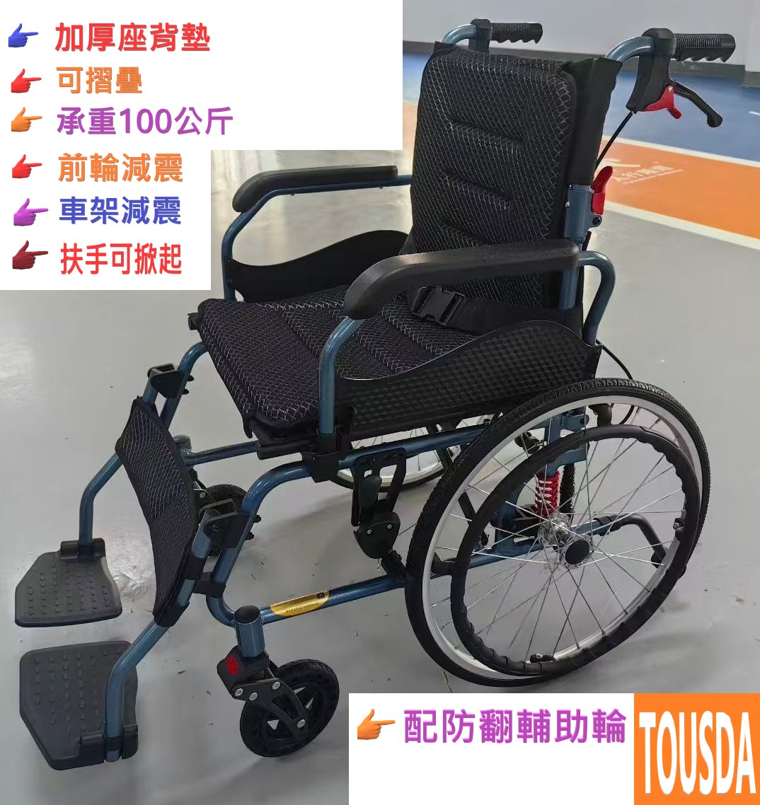 (最新設計 - 全車減震) FHLA01LAJ * 車架減震 * 前輪減震 * 扶手可掀起可鎖緊 * 手推位置可鎖車可解鎖 * 配防翻輔助輪 * 可摺疊 * 加厚座墊背墊更舒適 * 座位闊度: 46CM * 靠背高度: 41CM * 座位深度: 41CM * 承重: 100公斤 / 220磅 * 淨重: 12.7KG (New Design) FHLA01LAJ - Frame shock absorption - Front wheel shock absorption - Armrests can be lifted and locked - The push position can lock and unlock the wheelchair - Equipped with anti-tip auxiliary wheels - Foldable - Thickened seat cushion and back cushion for more comfort - Seat width: 46CM - Backrest height: 41CM - Seat depth: 41CM - Load capacity: 100 kg / 220 lbs - Net weight: 12.7KG