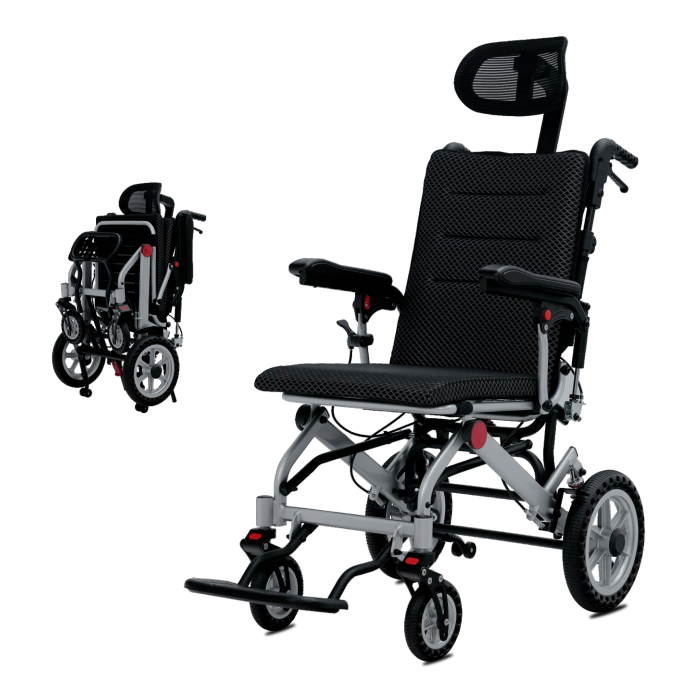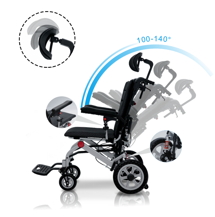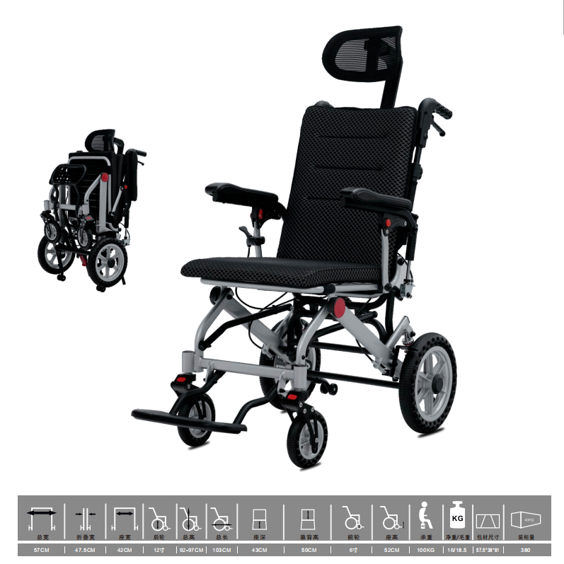 (最新設計) FHLJ07LJ-43 * 高背可調斜度100 - 140度 * 頭枕高度及斜度可調 * 前輪及後輪減震 * 扶手可掀起可鎖緊 * 手推位置高度可調 * 配防翻輔助輪 * 可摺疊 * 座位闊度: 42CM * 靠背高度: 50CM * 座位深度: 43CM * 承重: 100公斤 / 220磅 * 淨重: 15.7KG