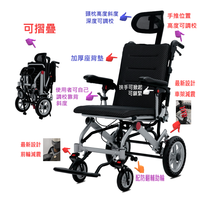 (最新設計 - 全車減震) FHLJ07LJ-43 * 高背可調斜度100 - 140度, 使用者可自行調校斜度 * 頭枕高度及斜度可調, 使用者可自行調校頭枕斜度 * 前輪減震 * 車架減震 * 扶手可掀起可鎖緊 * 手推位置高度可調 * 配防翻輔助輪 * 可摺疊 * 加厚可拆座墊背墊更舒適 * 座位闊度: 42CM * 靠背高度: 50CM * 座位深度: 43CM * 承重: 100公斤 / 220磅 * 淨重: 15.7KG *(Latest Design) FHLJJ07LJ-43* * High backrest with adjustable recline from 100 to 140 degrees, allowing users to customize the angle. * Headrest height and angle are adjustable, enabling users to set the headrest tilt. * Front wheel shock absorption. * Wheelchair frame shock absorption. * Flip-up and lockable armrests. * Adjustable handle height. * Equipped with anti-tip wheels. * Foldable design. * thicker seat and back cushion for enhanced comfort. * Seat Width: 42 cm * Backrest Height: 50 cm * Seat Depth: 43 cm * Maximum Load Capacity: 100 kg / 220 lbs * Net Weight: 15.7 kg