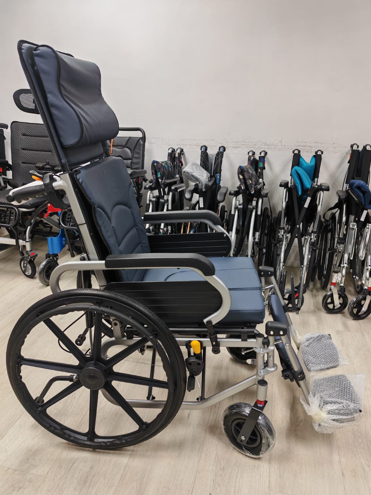 *** 通過歐盟 CE 認證, ISO 認證, C-NCAP五星安全認證 *** * 鋁合金車架 * 可掀扶手 * 可翻起可拆卸腳踏, 骨科升降腳踏 * 8吋PU前輪, 24吋PU後輪 * 高靠背, 油壓調校, 輕鬆緩降功能, 90度至170度平躺 * 獨特矩形扭推動桿設計,大幅提升輪椅移動時的穩定度,推行輕鬆省力。輕拉即可收合,操作簡單 * 輕便可摺疊 * 快拆式頭枕 * 帶可拆卸便盤 * 加厚座背墊 * 帶防翻輔助轆 * 承重: 100公斤 * 淨重: 21公斤