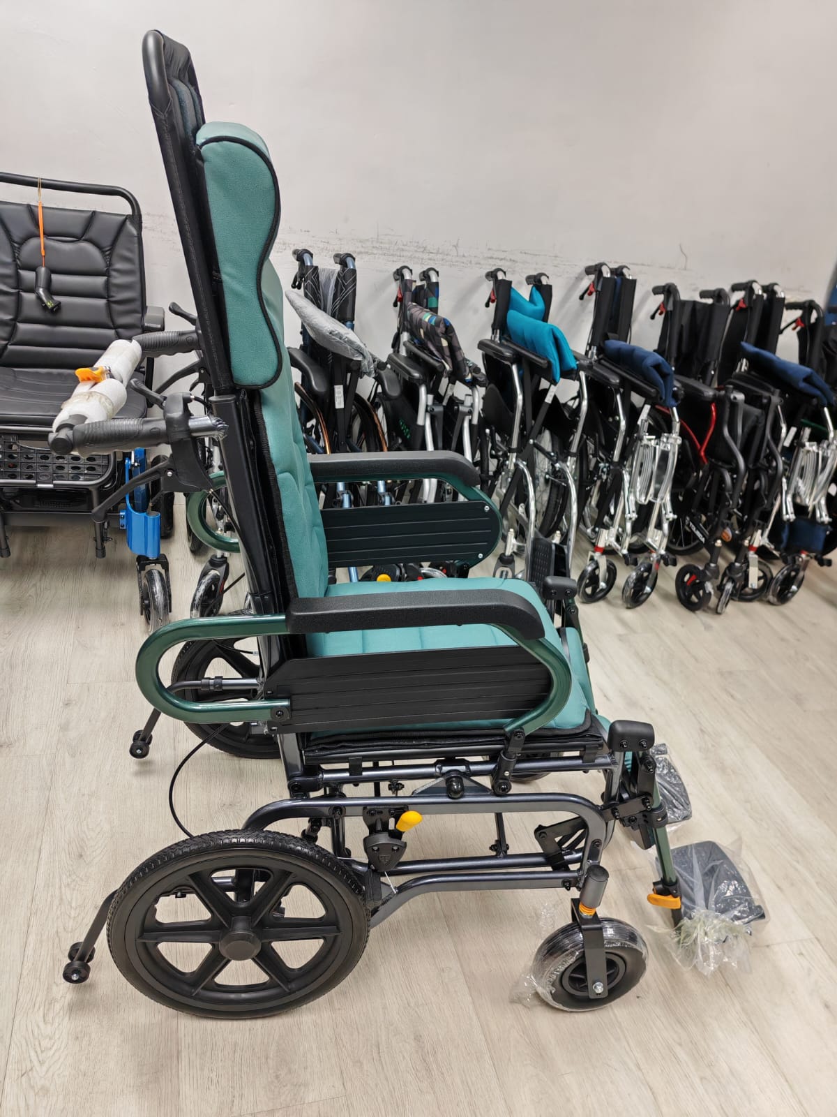 型號:T07LBGCJ-16P 車架:鋁合金材質 / 雙工字折疊結構 表面處理:噴粉啞灰,防腐蝕且耐磨,外觀簡潔大方 前輪:8吋PU萬向輪/加厚/減震設計前輪, 靈活轉向,適合室內或平坦路面 後輪:16吋實心花紋輪,免充氣, 且抓地力強, 制動系統:雙煞(自鎖煞把 + 後輪手動煞閘),緊急情況下可快速鎖定,保障安全 人體工學可平躺 高背 ***液壓*** ***無重力***(當調整輪椅靠背傾斜度時,座位, 扶手及腳踏會根據靠背角度進行連動式調節,保持上身及下肢自然支撐狀態) ***分壓式*** 可調節靠背角度 * 獨特矩形扭推動桿設計,大幅提升輪椅移動時的穩定度,推行輕鬆省力。輕拉即可收合,操作簡單 可拆卸頭枕,長時間使用更舒適 可掀扶手(方便轉移) 骨科腳托, 腳踏可拆卸 腳踏高度6段調校,適配不同用戶需求 座墊背墊:加厚, 透氣親膚 配安全帶,提升乘坐穩定性 可摺疊 承重:100公斤 / 220磅 淨重:18公斤 可摺疊放車尾箱方便收納