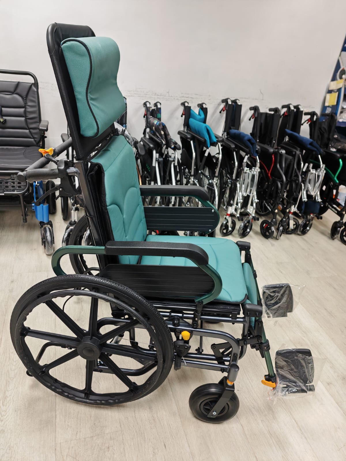 型號:T07LBGCJ-24P 車架:鋁合金材質 / 雙工字折疊結構 表面處理:噴粉啞灰,防腐蝕且耐磨,外觀簡潔大方 前輪:8吋PU萬向輪/加厚/減震設計前輪, 靈活轉向,適合室內或平坦路面 後輪:24吋實心花紋輪,免充氣, 且抓地力強, 制動系統:雙煞(自鎖煞把 + 後輪手動煞閘),緊急情況下可快速鎖定,保障安全 人體工學可平躺 高背 ***液壓*** ***無重力***(當調整輪椅靠背傾斜度時,座位, 扶手及腳踏會根據靠背角度進行連動式調節,保持上身及下肢自然支撐狀態) ***分壓式*** 可調節靠背角度 * 獨特矩形扭推動桿設計,大幅提升輪椅移動時的穩定度,推行輕鬆省力。輕拉即可收合,操作簡單 可拆卸頭枕,長時間使用更舒適 可掀扶手(方便轉移) 骨科腳托, 腳踏可拆卸 腳踏高度6段調校,適配不同用戶需求 座墊背墊:加厚, 透氣親膚 配安全帶,提升乘坐穩定性 可摺疊 承重:100公斤 / 220磅 淨重:21公斤 可摺疊