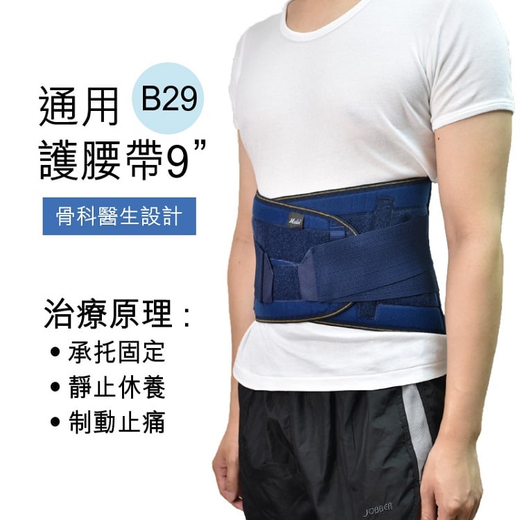 B29 - 通用護腰帶 9" 適用症狀 背痛/纖腰收腹帶/預防腰傷/穩定性低位腰椎骨折 產品特點 1)透氣彈性質料 2)不合乳膠,防敏物料 3)壓力均勻,穿戴舒適 4)加強承托腰背 5)防止因擺動而誘發痛楚 6)物理治療復康腰帶透氣彈性物料 尺碼:通碼(腰圍: 26" - 42") 注意事項: 1.使用後若皮膚出現過敏性紅疹,請立即停止使用並尋求醫生診治 2.產品應佩戴舒適,以不影響血液迴圈為本 清洗: 1.可用溫水或加入少量洗衣劑,以手洗方式清洗